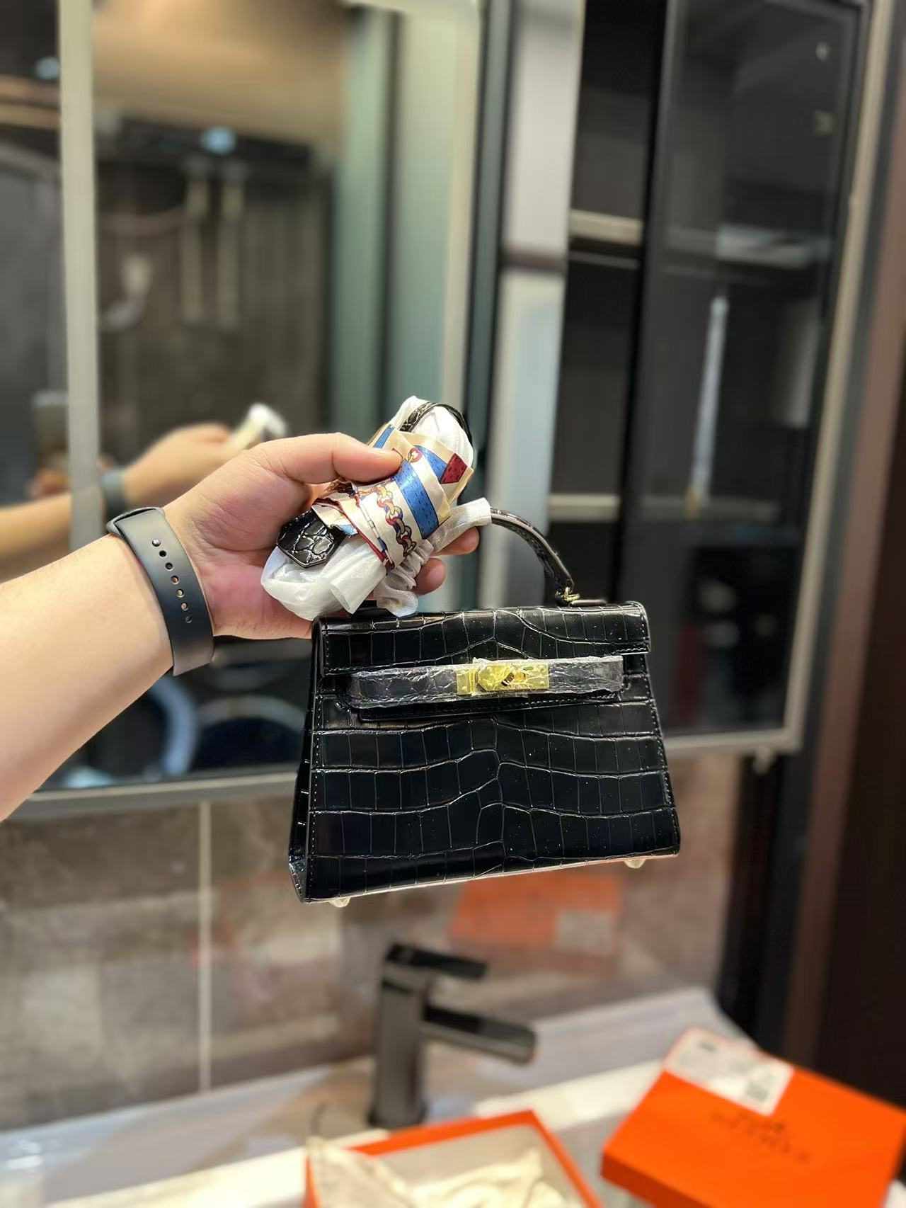 Hermès Kelly second generation, original lacquered crocodile pattern, cowhide quality,Black